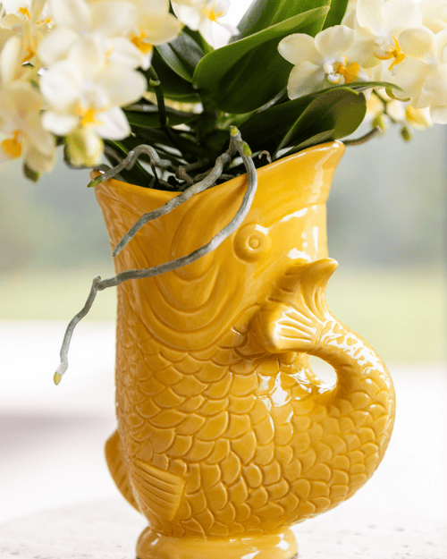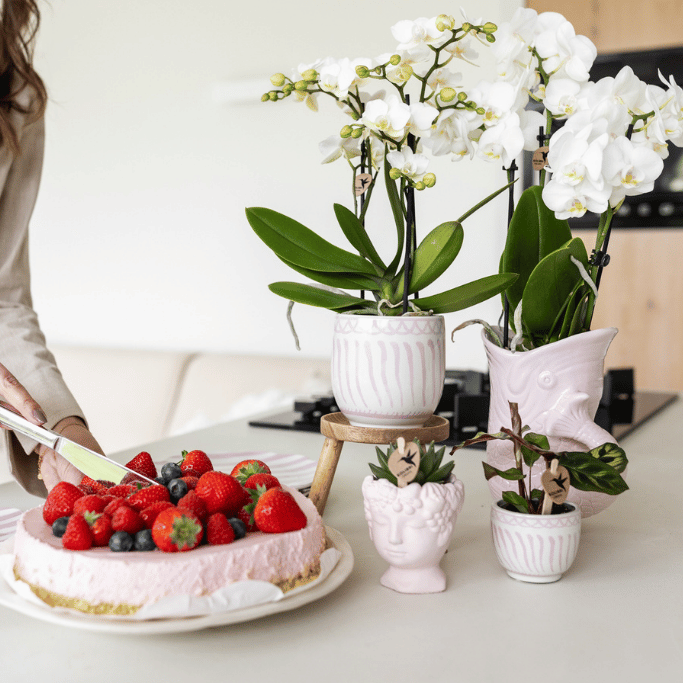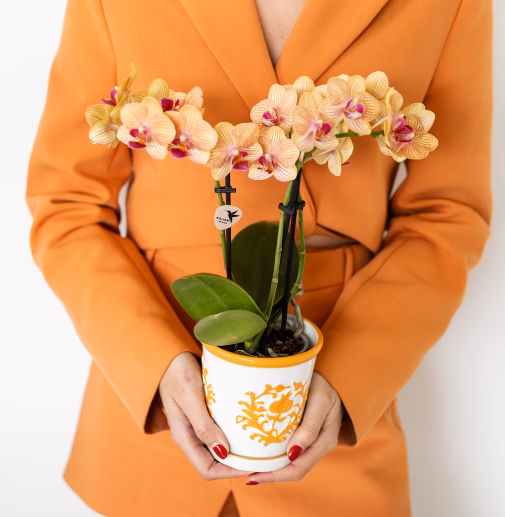 Orchideeën stralen in deze setting. In kleurrijke keramieken potten komen de kleuren nog intenser naar voren. Samen met fris groen ontstaat een rijk, gelaagd geheel dat doet denken aan een mediterrane patio.