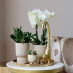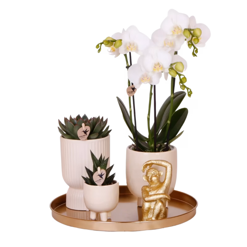 Trend-alarm! Een eye-cather in huis halen doe je met de Le Chic set. Met een combinatie van Diabolo potten is deze set een echte trend, die straalt met glimmende, gouden details. In de set vind je de mooi sneeuwwitte Amibilis orchdee met 2 of 3 takken terug, daarnaast staan de Succulenten met hun groene kleur te stralen. Om de set een leuke, speelse twist te geven, maakt de Monkey long tail zijn entree. Staat Le Chic binnenkort bij jouw op tafel?