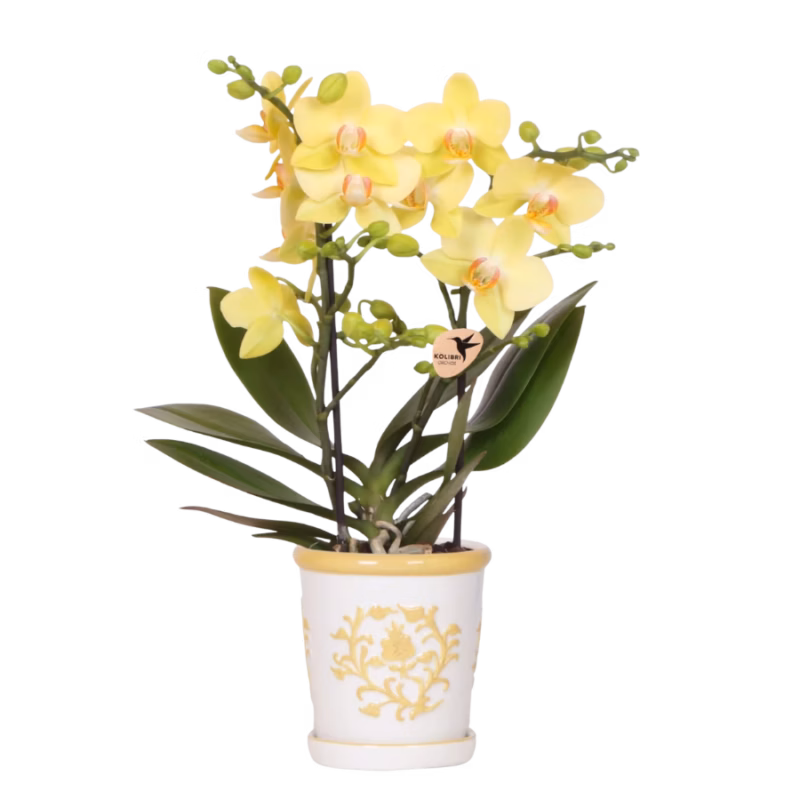 Hoe vrolijk en zonnig is deze combinatie van de gele Kolibri Orchids ‘Albenga’ gestyled in de Malaga sierpot in het geel. Een perfecte match die direct een zomers gevoel in huis brengt! De stralende gele bloemen van de Albenga orchidee contrasteren prachtig met de sierlijke, klassieke details van de Malaga pot.