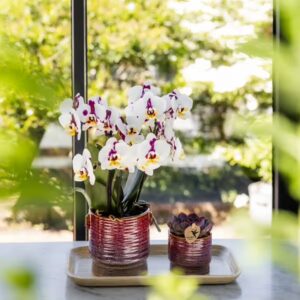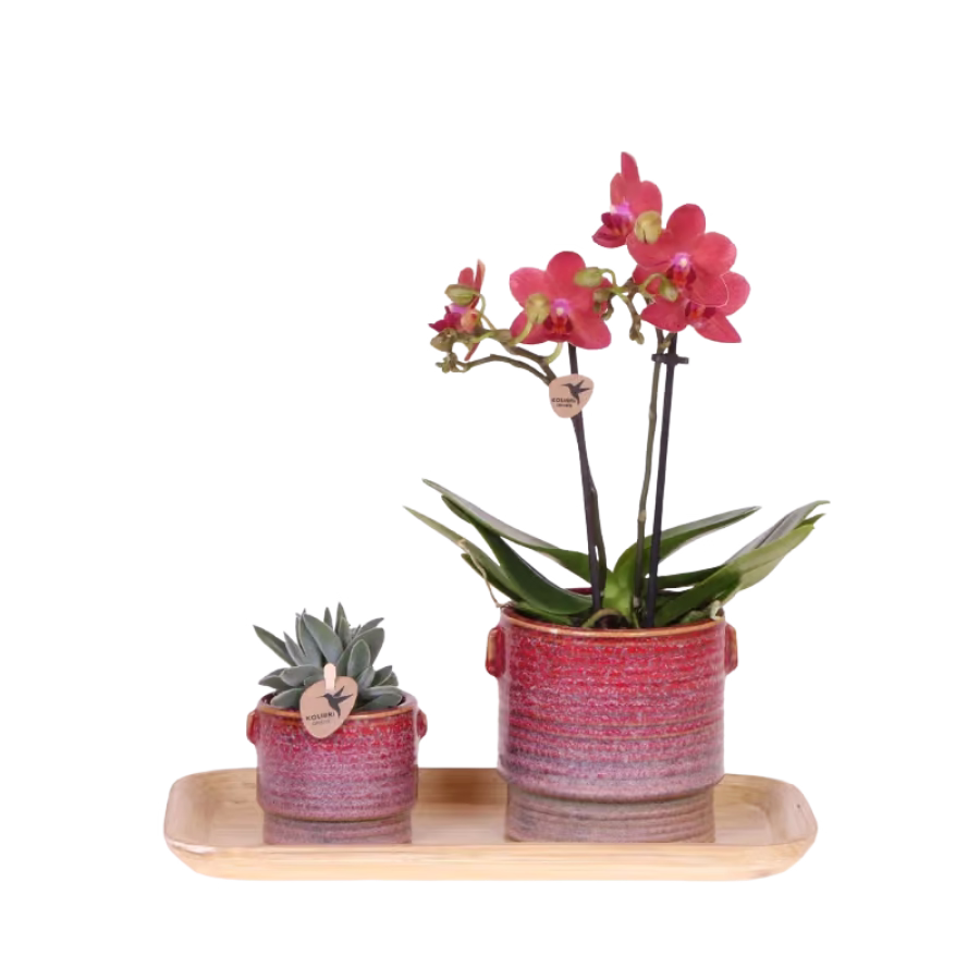 Geef kleur, sfeer én stijl cadeau met de Gift Set Aura. Deze set combineert de keramieken Aura potten uit onze Bold Seventies collectie (9 cm en 6 cm) met een krachtige rode Kolibri Orchids Congo en een Kolibri Greens. De planten staan op een bamboe plate, wat zorgt voor een rustige basis met een natuurlijke uitstraling. De diep rode glazuurlaag van de Aura potten geeft een warm retrogevoel, terwijl de planten zorgen voor levendigheid en balans. De Congo orchidee trekt de aandacht met haar dieprode bloemen, en de groene succulent maakt het plaatje compleet. Deze set is kant-en-klaar om te geven – of om gewoon zelf van te genieten.