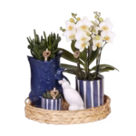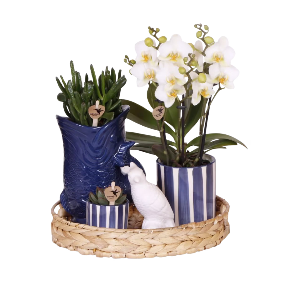 De set bevat twee blauwe Painted Stripe sierpotten: één gevuld met een vrolijke succulent (6 cm pot) en één met een prachtige witte Lausanne Phalaenopsis orchidee (9 cm pot). Daarnaast krijg je een speelse, donkerblauwe Fish sierpot met de bijzondere Crassula Hobbit succulent (9 cm pot).