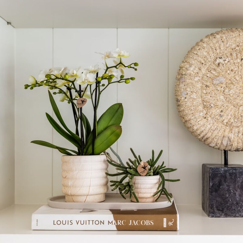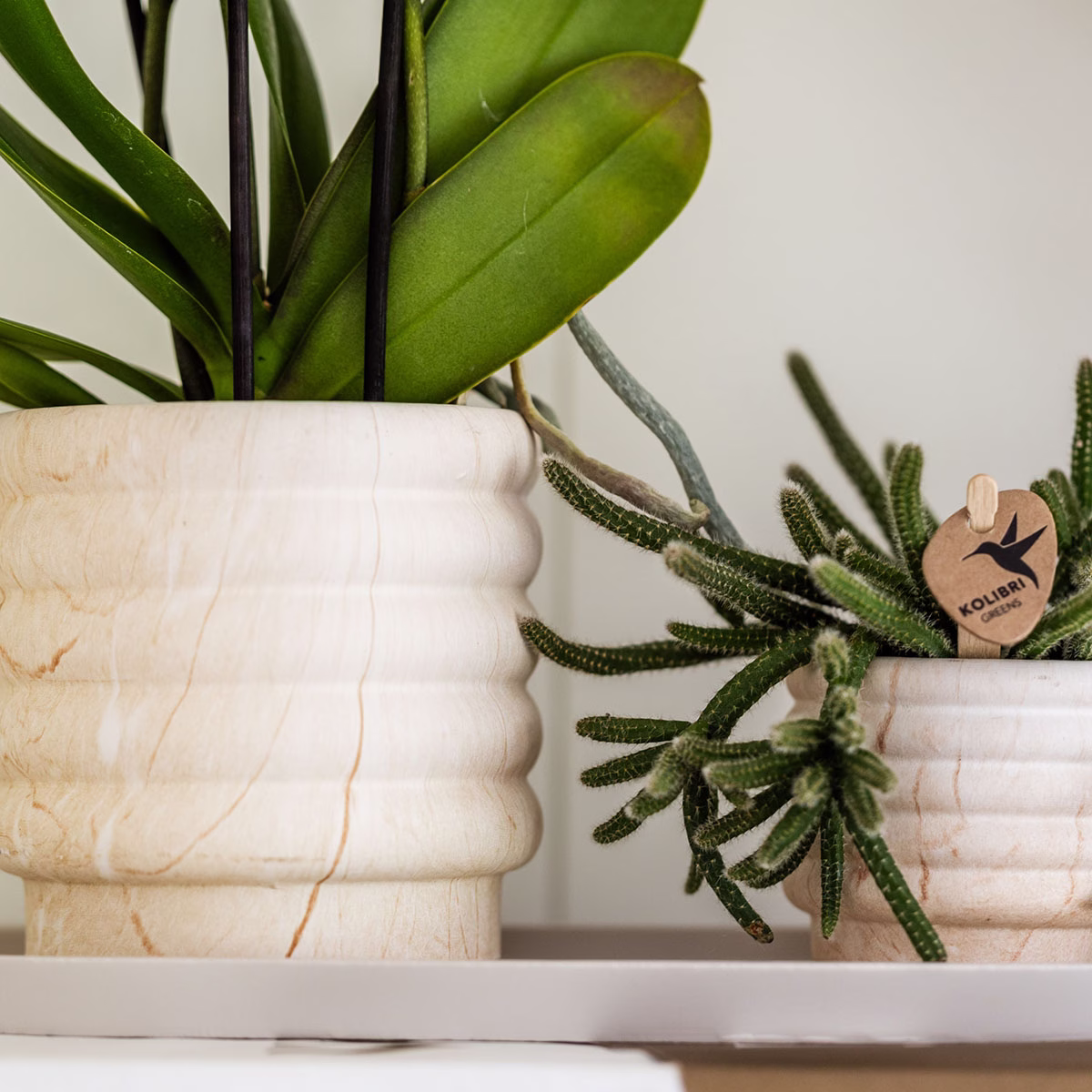 Voeg een vleugje luxe toe aan je interieur met de Marble Light pot. Deze stijlvolle keramische pot heeft een verfijnde marmeren uitstraling en is beschikbaar in drie maten: 6 cm, 9 cm, en 12 cm. Perfect om te mixen en matchen! Combineer verschillende formaten voor een speels, maar elegant effect op tafel, gevuld met prachtige Kolibri Orchids of groene planten.