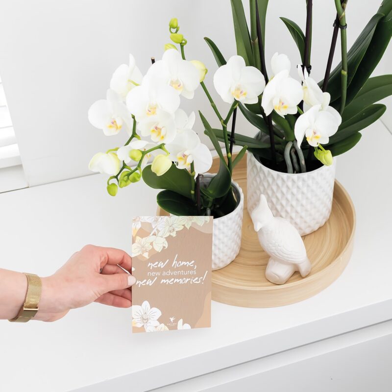 Een kaartje geven is een klein gebaar dat warmte en verbondenheid brengt. Met onze ‘New Home’-kaart laat je iemand weten dat je aan hem of haar denkt, zelfs op afstand! Schrijf een persoonlijke boodschap, voeg het toe aan een cadeau en maak van jouw liefde iets tastbaars. Combineer de kaart met een Kolibri orchidee of groene plant voor een cadeau dat niet alleen mooi is voor in zijn of haar nieuwe huisje, maar ook maandenlang blijft bloeien.