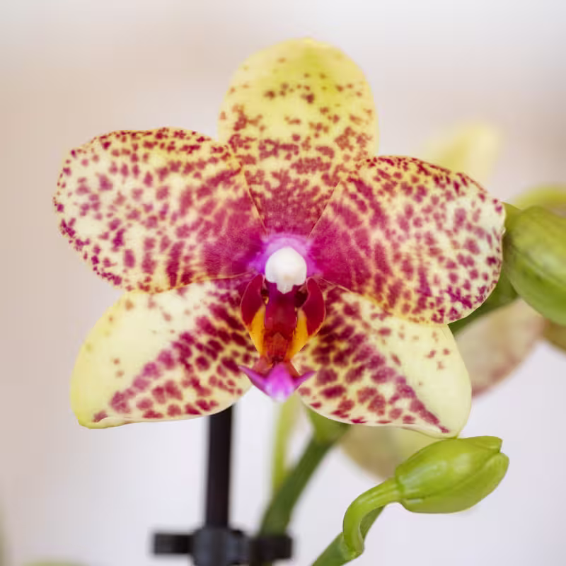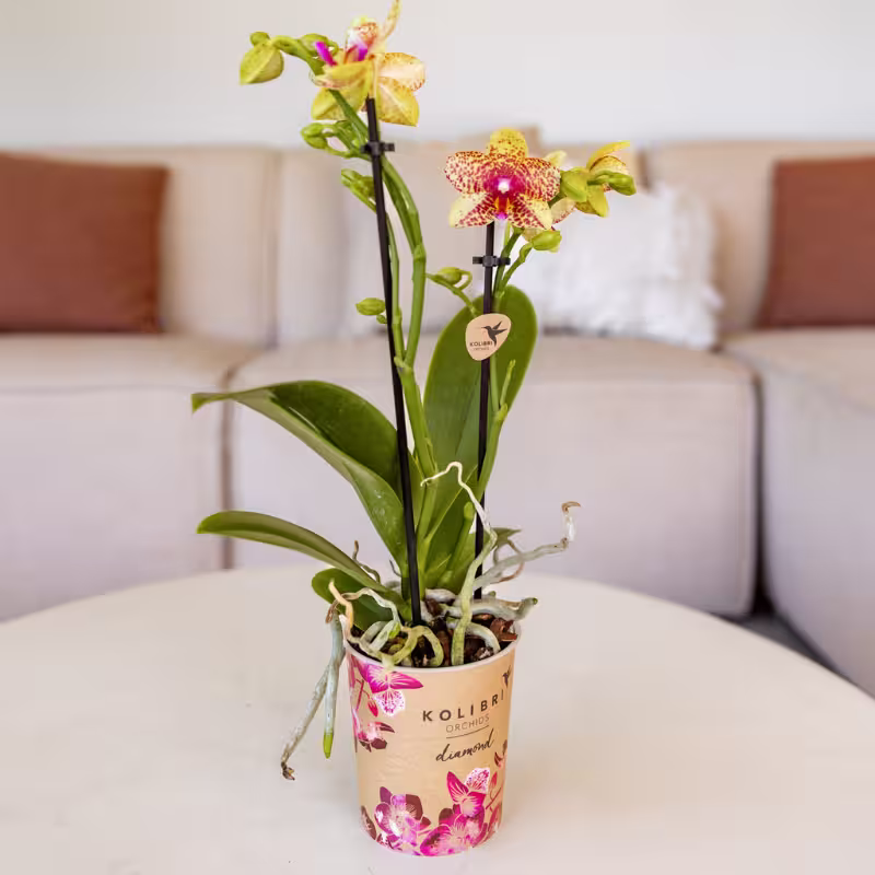 De orchidee wordt geleverd met 2 of 3 stevige takken, afhankelijk van de actuele beschikbaarheid. Omdat we met levende producten werken, kunnen er kleine variaties zijn in het aantal takken of bloemen.