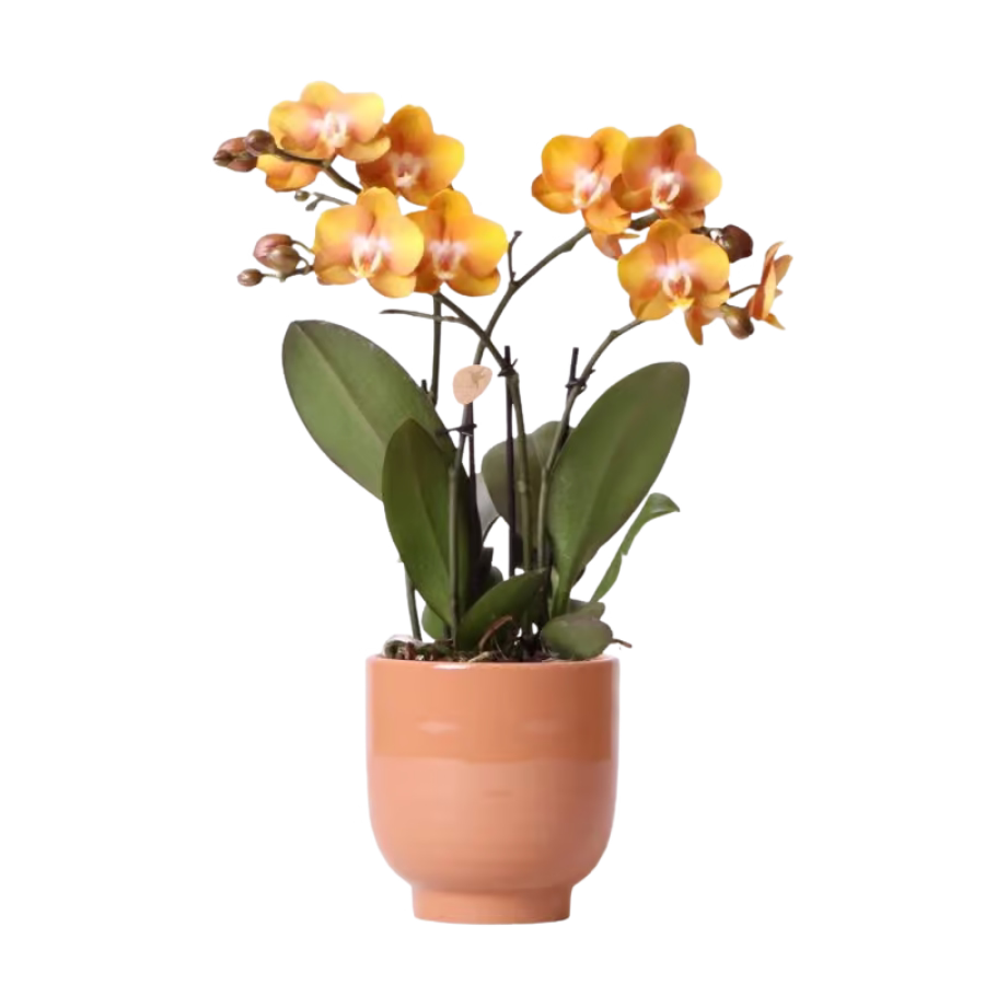 Deze mooi gekleurde Phalaenopsis orchidee zal kleur brengen in jouw interieur. De orchidee is te herkennen aan haar bijzondere geel met oranje bloemen en geeft 2 tot 3 stevige takken. De orchidee is gecombineerd de Glazed pot Cognac. Dit is een cilindervormige pot met aan de onderkant een subtiel golvend patroon en glanzende afwerking. Deze pot heeft een cognac kleur en een potmaat van 12cm. De natuurlijke kleur van deze pot past goed bij deze orchidee en zal pronken in jouw huis!