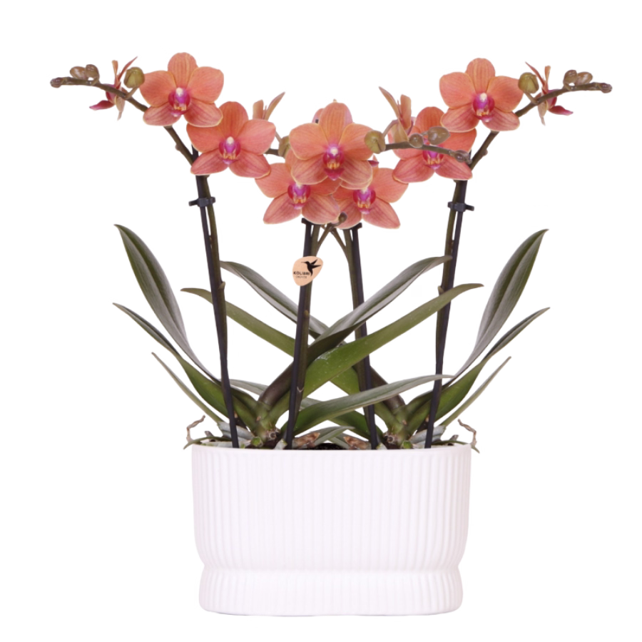 Geef je interieur een warme en stijlvolle uitstraling met deze orchideeënset in de Diabolo Twin wit sierpot. De set bestaat uit twee oranje Bolzano orchideeën Ø9cm, bekend om hun bijzondere kleurverloop van warm oranje naar roze in het hart van de bloem. De elegante dubbele pot in mat wit maakt deze set tot een echte blikvanger in elke ruimte. Een perfecte keuze voor liefhebbers van bijzondere kleuren — én een prachtig cadeau voor elke gelegenheid. Omdat we met levende producten werken, kunnen het aantal takken en de grootte van de bloemen licht afwijken van de foto.