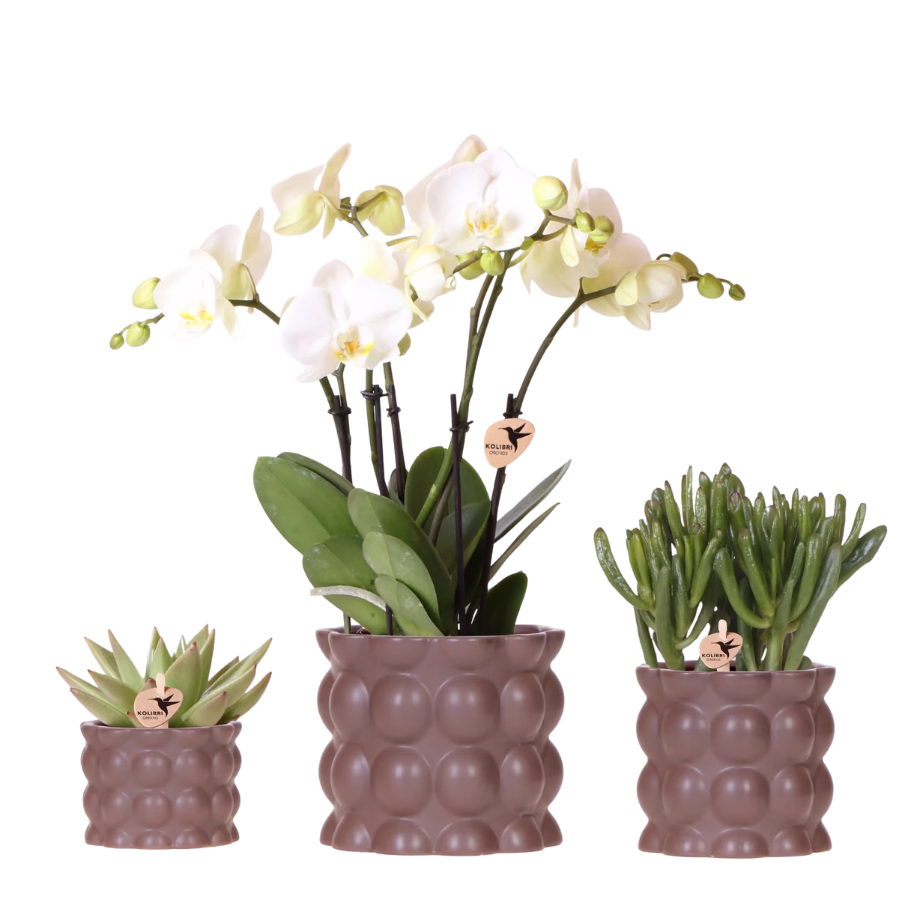 Deze set bestaat uit een witte Phalaenopsis orchidee ‘Ghent’ en twee succulenten, elk in een andere potmaat (⌀6, ⌀9 en ⌀12 cm). De combinatie van fris groen en helder wit in rustige aardetinten zorgt voor een kalme uitstraling. Perfect voor wie houdt van eenvoud en natuurlijke materialen. Zet de set samen op tafel of verspreid ze door de ruimte voor een ontspannen sfeer in huis.