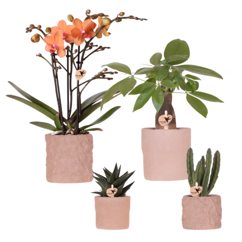 Breng een stijlvolle, natuurlijke sfeer in huis met deze prachtige plantenmix. Deze exclusieve set bestaat uit één Bolzano orchidee, één Pachira boompje, en twee kleine succulenten, gecombineerd in 2x de Star Fish en 2x de Rustic potten in een warme bruine tint.