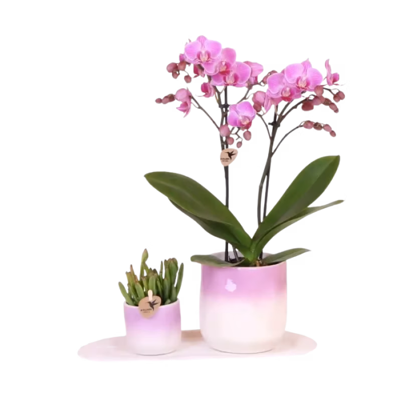 De set bestaat uit een roze Phalaenopsis orchidee ‘Vienna, en een trendy succulent. De prachtige keramieken potten met kleurverloop van roze naar wit laten de planten nog meer stralen.