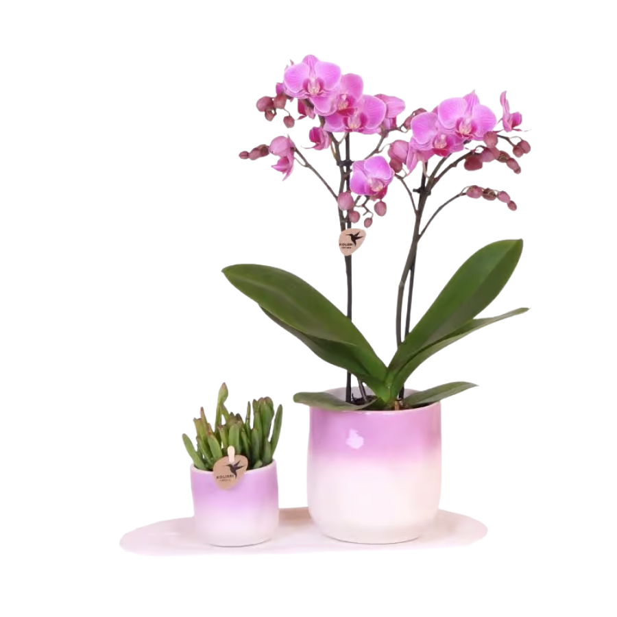 De set bestaat uit een roze Phalaenopsis orchidee ‘Vienna, en een trendy succulent. De prachtige keramieken potten met kleurverloop van roze naar wit laten de planten nog meer stralen.