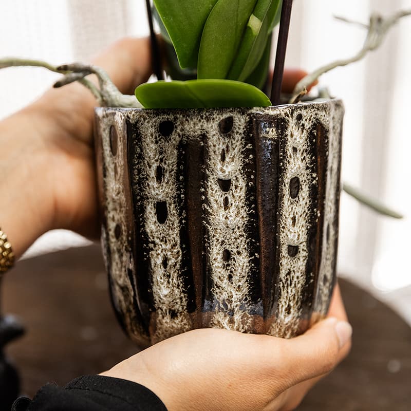 Het diepe kleurenpalet en het grove reliëf geven de pot een grotesque charme, terwijl het gebruik van luxe materialen zoals hoogwaardig keramiek zorgt voor een verfijnde balans tussen ruw en elegant.