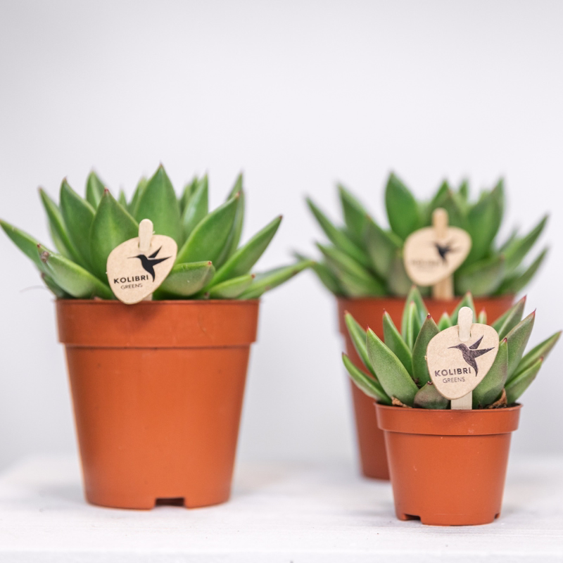 Breng kleur in jouw interieur! Dit plantje genaamd Succulent Echeveria Miranda is een stevig vetplantje die wel tegen een stootje kan. De opvallende kenmerken van de Echeveria zijn de dikke en bijzondere blaadjes. Deze blaadjes variëren per soort in kleur van grijsgroen tot lila en roodachtig. De Echeveria Miranda herken je aan haar licht groene kleur. Wist je dat sommige Echeveria’s zelfs kunnen bloeien. Dan komen er bloeistengels uit de plant versierd met gele, oranje, rode of roze bloemetjes. Het is een sterke plant die redelijk makkelijk is te onderhouden. Je hoeft hiervoor geen groene vingers te hebben! Wij hebben de Echeveria Miranda leverbaar in de potmaten 6cm en 9cm.