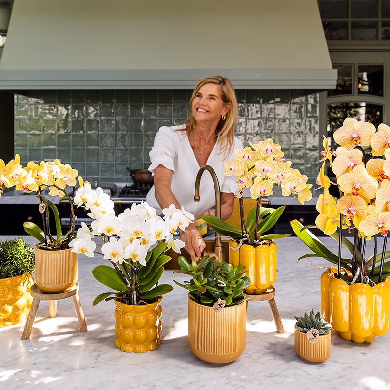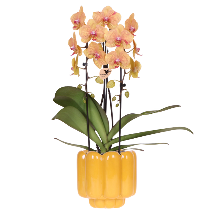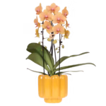 Geel roze Sunny Bunny orchidee in Retro sierpot | oker