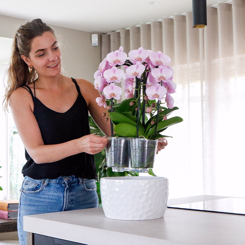 Met deze prachtige orchideeën schaal ben jij direct klaar. Deze katoenen mand is opgemaakt met drie orchideeën (potmaat 12cm) uit onze Jewel collectie. De mand is gemaakt van gedraaid katoen en heeft hierdoor een natuurlijk uitstraling. De mand is uitgerust met een ingebouwd watergeefsysteem. De orchideeën in de schaal worden geleverd met een watergeeflont. Door een waterlont te gebruiken, hoef je de orchideeën minder vaak uit de schaal te halen. Hierdoor gaan je orchideeën nóg langer mee.