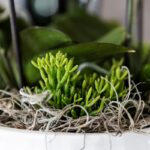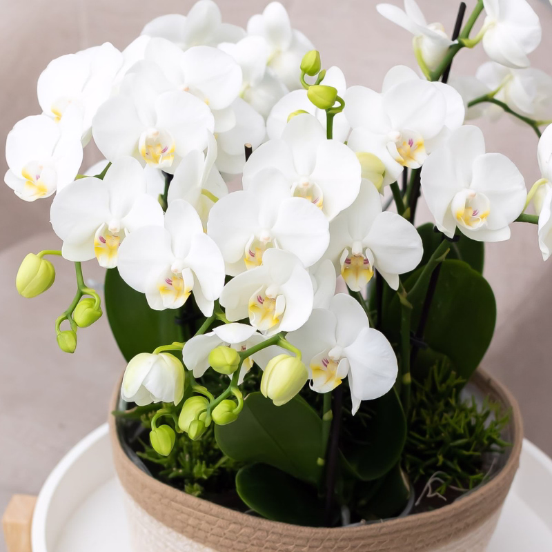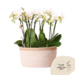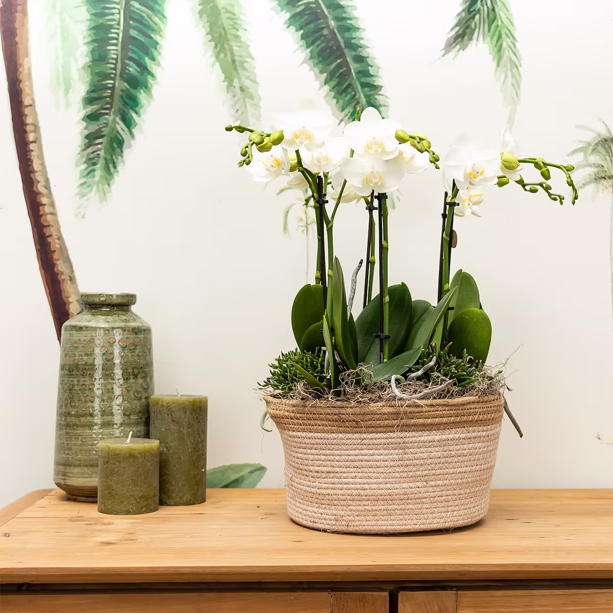 Met deze prachtige orchideeën schaal ben jij direct klaar. Deze katoenen mand is opgemaakt met drie orchideeën (potmaat 9cm) en drie Rhipsalis plantjes (potmaat 6cm). De mand is gemaakt van gedraaid katoen en heeft hierdoor een natuurlijk uitstraling. De mand is uitgerust met een ingebouwd watergeefsysteem. De orchideeën in de schaal worden geleverd met een watergeeflont. Door een waterlont te gebruiken, hoef je de orchideeën minder vaak uit de schaal te halen. Hierdoor gaan je orchideeën nóg langer mee.