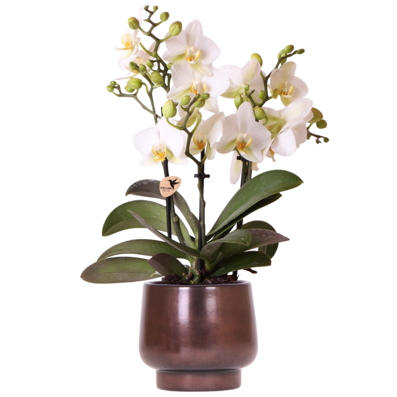 Geef je interieur een warme, luxe uitstraling met deze combinatie van de Scandic Copper pot Ø9cm en de witte Lausanne orchidee. De diepe koperkleur van de pot vormt een stijlvol contrast met de frisse, zuiver witte bloemen van de orchidee. Een moderne blikvanger die perfect past in zowel een minimalistisch als een chic interieur. De Lausanne orchidee wordt rechtstreeks vers van de kweker geleverd, zodat je verzekerd bent van kwaliteit en een lange bloeitijd. Omdat we met levende producten werken, kunnen het aantal takken en de grootte van de bloemen licht afwijken van de foto.