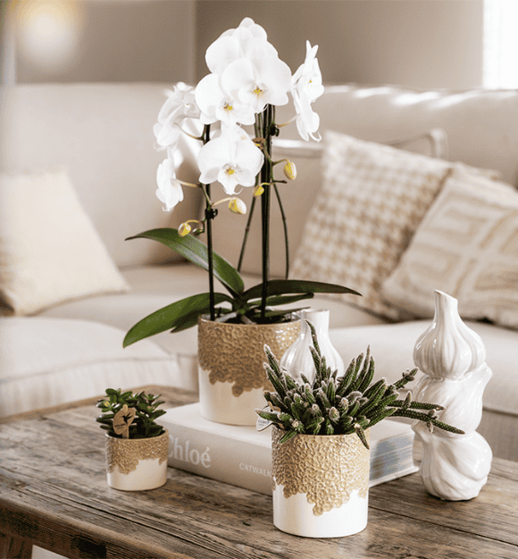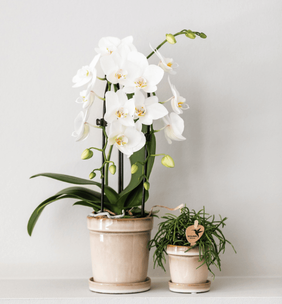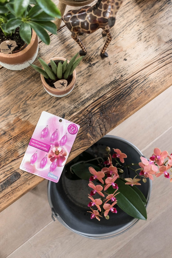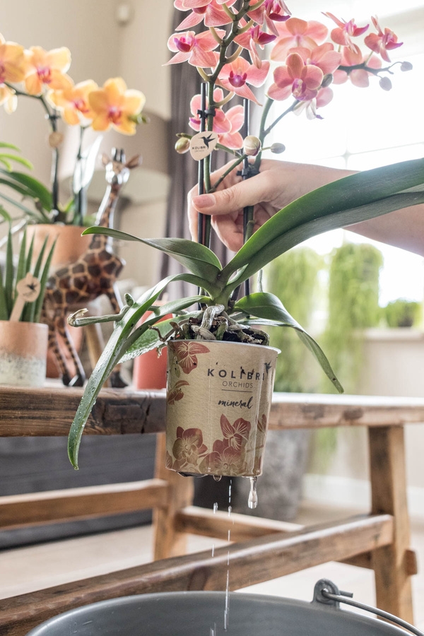 Laat de plastic kweekpot van de orchidee 5 minuten in water staan. Til de orchidee in de kweekpot daarna uit de sierpot en laat het water goed uitlekken. Nu kun je jouw orchidee terug in de sierpot zetten en kan deze weer heerlijk genieten van vers water.