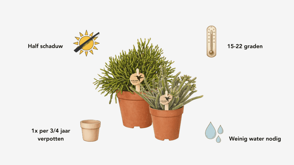 Je kunt je Rhipsalis verzorgen door deze op een halfschaduw plek in jouw huis neer te zetten. Een halfschaduw plek is een plek ongeveer 2 tot 3 meter afstand van raam, of direct voor het raam op het noorden. Rhipsalis groeit van oorsprong namelijk in een tropisch klimaat.